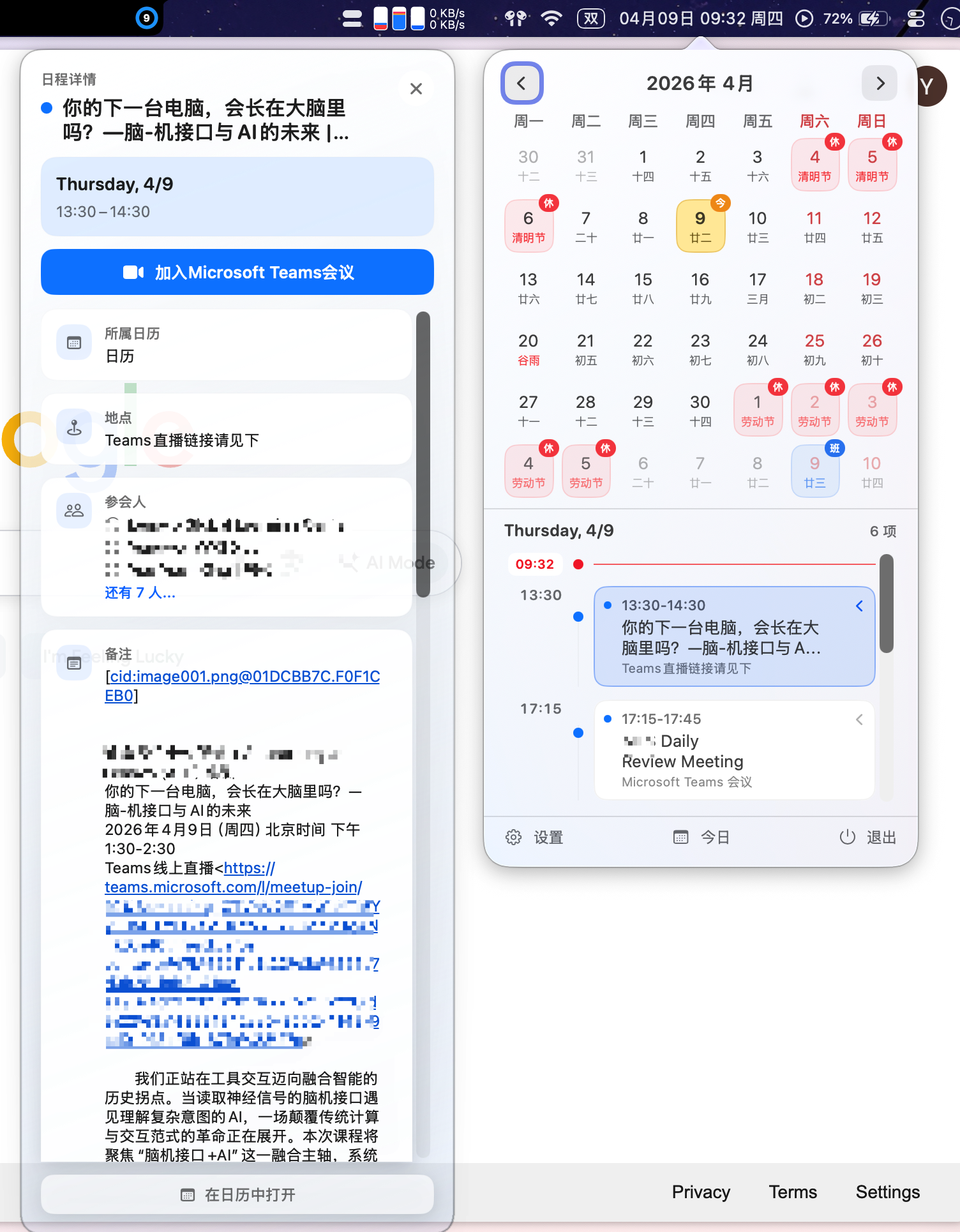 这些动作如果每次都要打开完整的日历应用,其实很容易打断节奏。菜单栏才是更自然的入口。